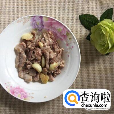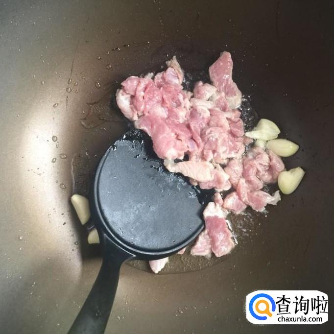 然后把瘦肉切成薄片并用适量的地瓜粉裹一下,倒入锅中翻炒五分钟,装盘备用。