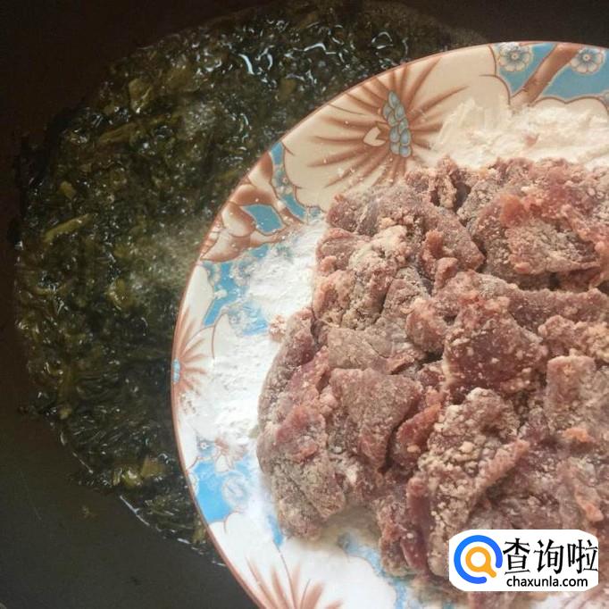 然后将牛肉用适量的地瓜粉裹一下,倒入锅中开大火煮两分钟,如下图所示。牛肉一定不要煮的太久,否则牛肉会煮的太老。