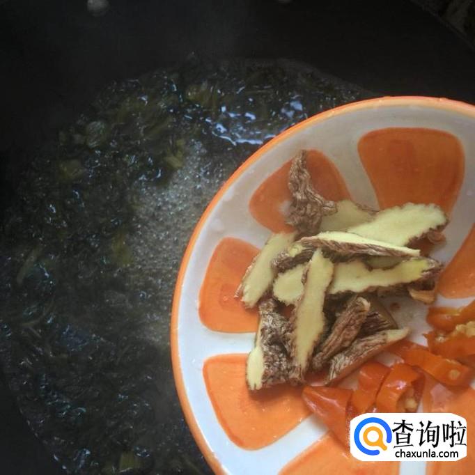 然后把生姜切成薄片,辣椒切成辣椒圈,倒入锅中煮两分钟,如下图所示。