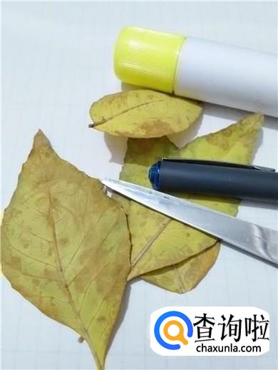 准备几片树叶、剪刀、水笔、胶棒、纸。