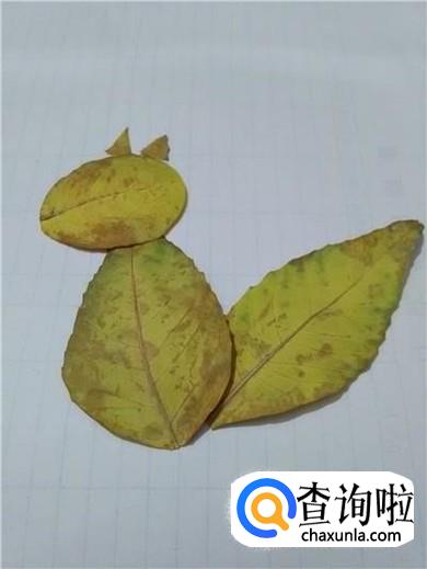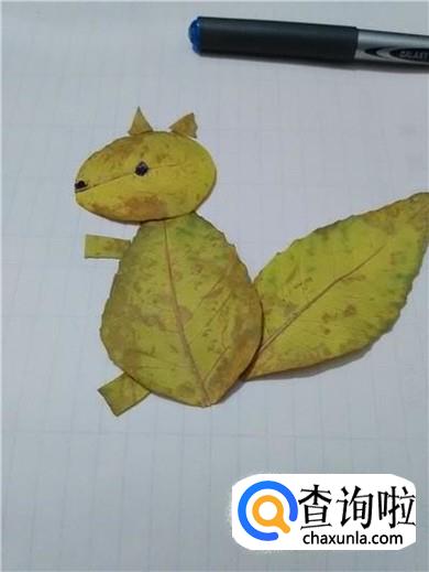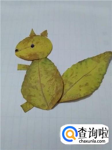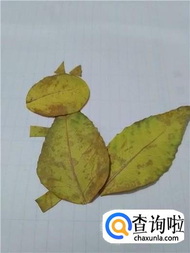 再用一片大叶子粘在松鼠身体右侧,当作尾巴。