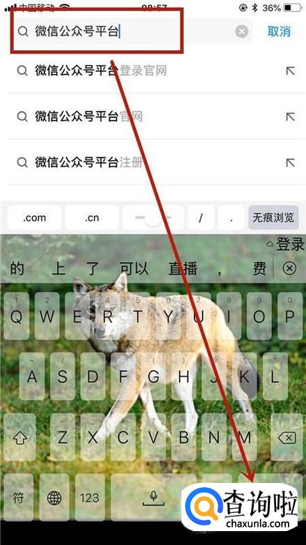 然后输入微信公众号平台并点击搜索,如下图所示。
