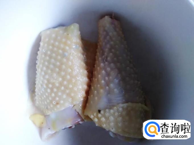 把鸡腿斩成两段放到碗里,然后把全部药材放进去。