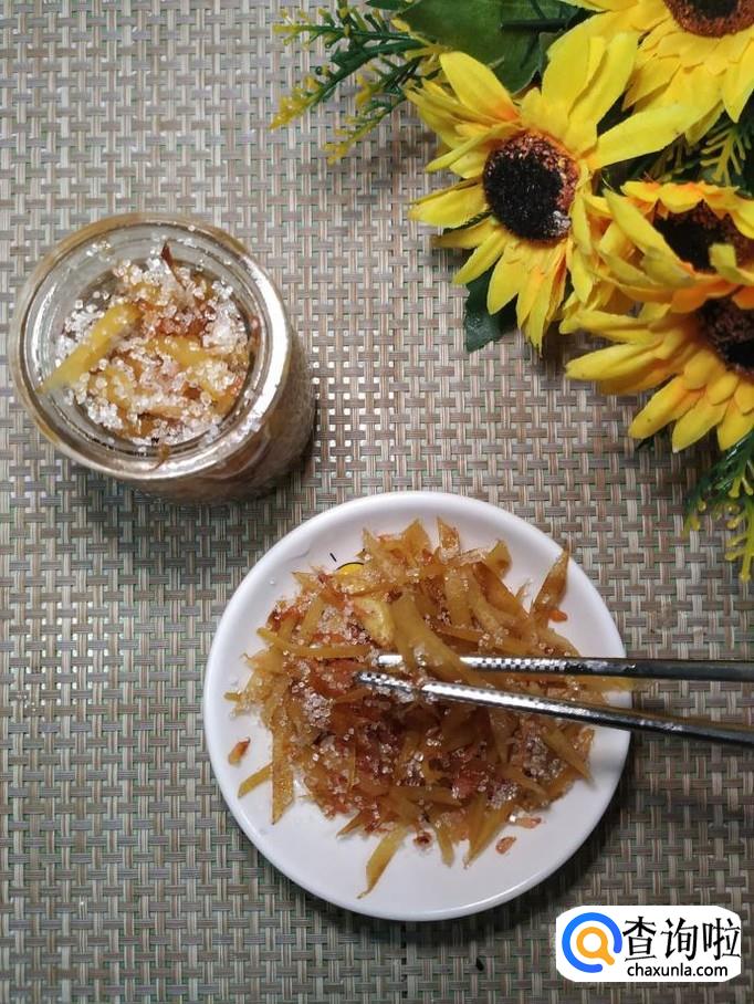 家里有细白砂糖的,可以撒上一些,直接拿在手上,当成柚皮糖吃也可以的。既可以泡茶,又可以直接吃,真的是一举两得。