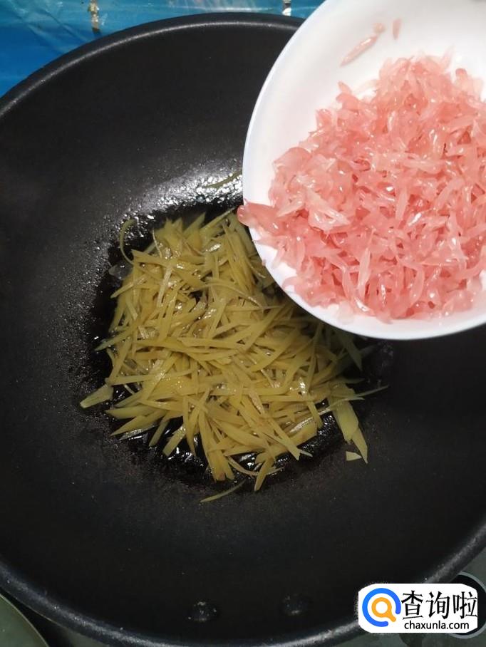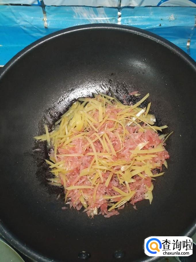 炒至柚皮丝开始变软,将柚子果肉,倒入锅中,翻炒均匀。