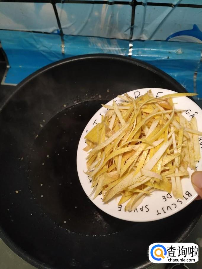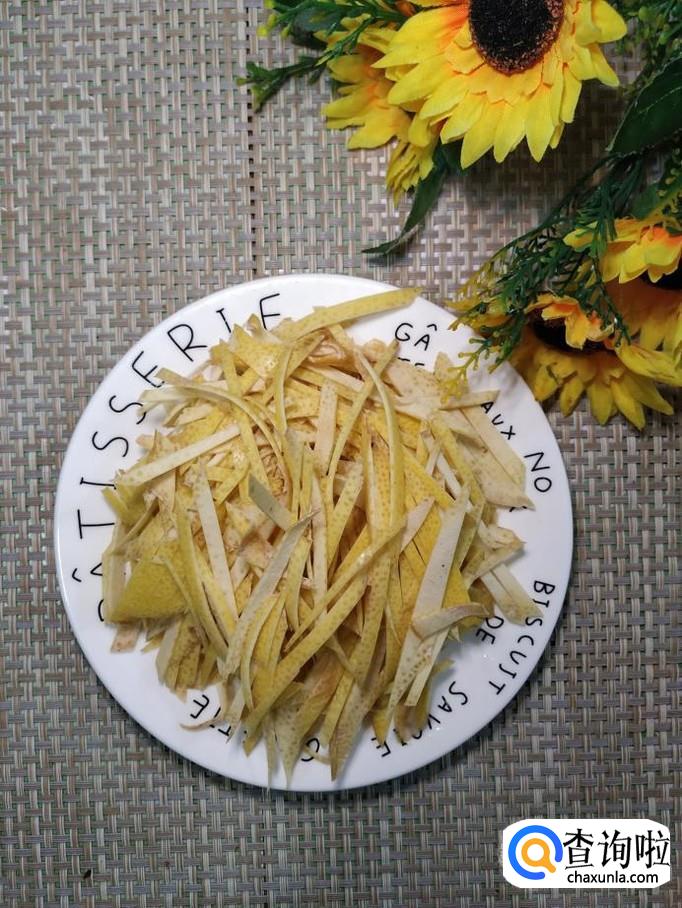准备一个红柚子,用盐水洗净外皮,然后用削皮刀削去薄薄的一层外皮,然后用刀切成细丝,放入盘中备用。