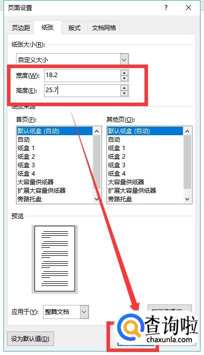 在页面设置-纸张大小下的“宽度”和“高度”输入框中输入b5尺寸(此处以182mmX257mm为例),点击“确定”即可。