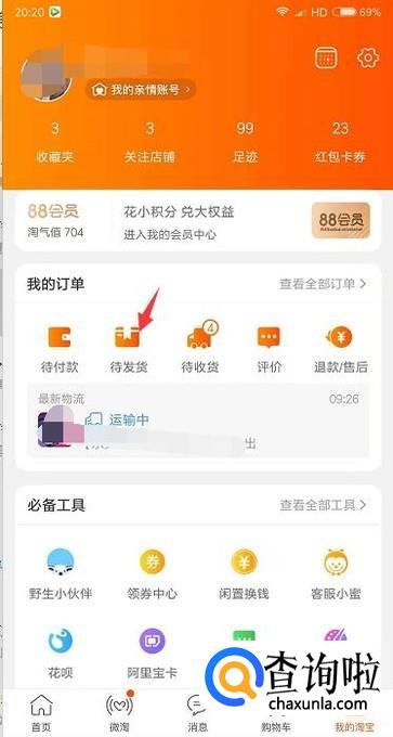 首先我们打开淘宝登录账号后,在个人页面里点击待发货的选项。