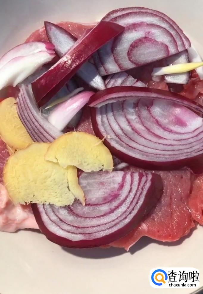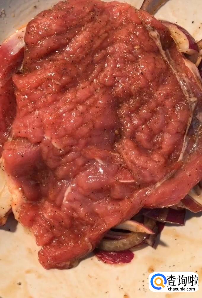 然后我们将牛肉放入碗中,放入圆葱,姜,黑胡椒酱
