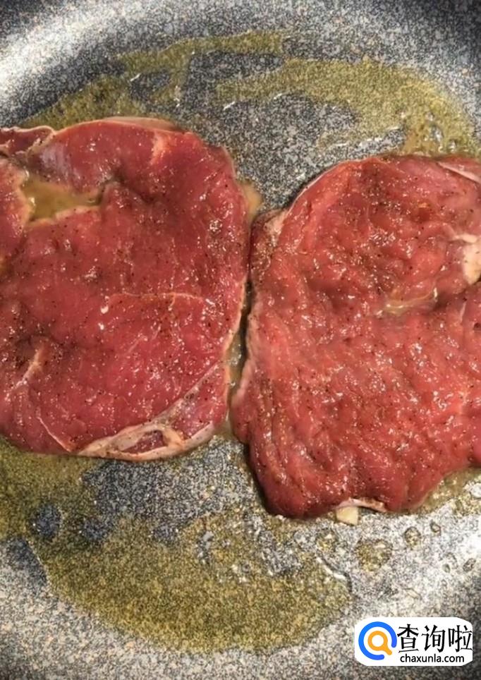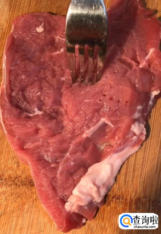 首先我们将牛肉切大片,用叉子在上面叉几个小孔