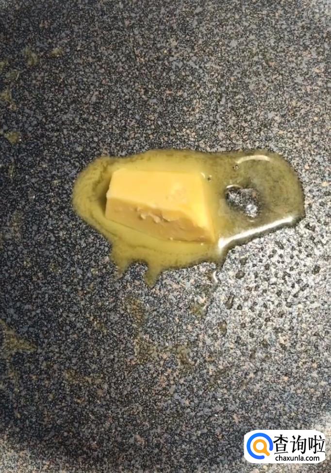 接着我们在平底锅内放一块黄油,加热至黄油融化