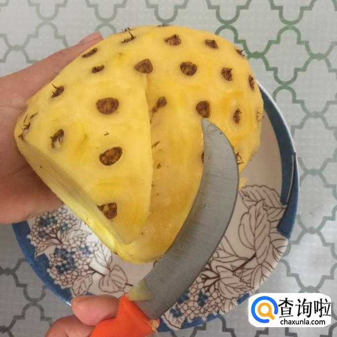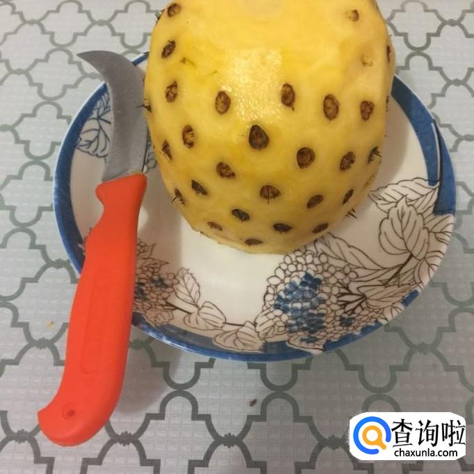 然后用刀削去菠萝的眼,如下图所示。