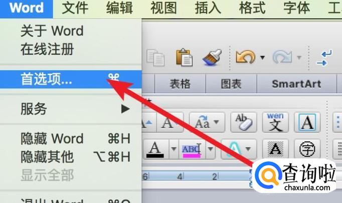 要取消首字母自动大写,我们点击菜单栏上的‘Word’--‘首选项’。