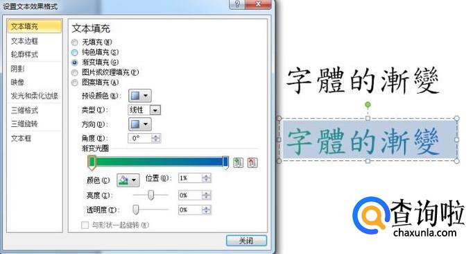 首先,选取需要渐变的字体,右击,选择"文字效果格式",然后选择"文字填满"中的"渐层填满",最后通过选择渐变类型、渐变方向、渐变角度、停驻点位置及颜色等来达到不同的字体渐变效果。