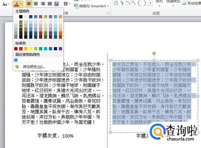 字体灰度设置时,首先选中要调整灰度的字体,然后点击选取相应的颜色即可。
