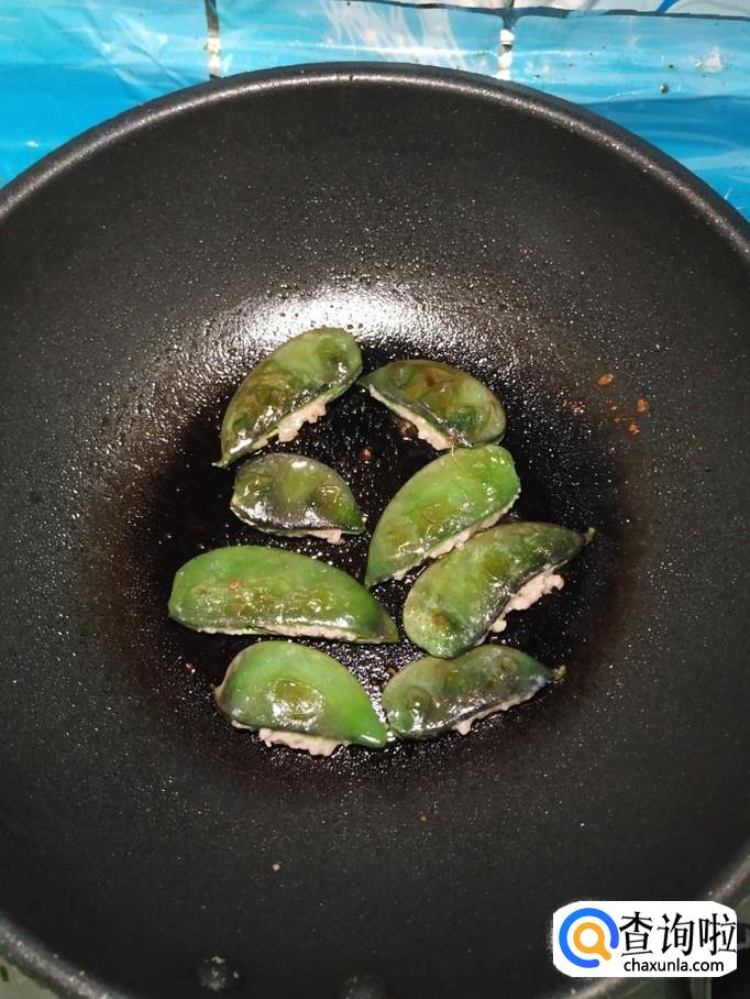 把腌好的五花肉塞进扁豆夹中间,全部塞好之后,放入盘中备用。