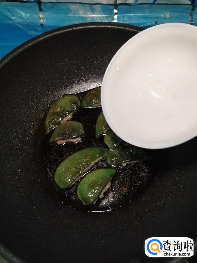准备适量新鲜的扁豆,将扁豆洗净后,撕去一边的豆筋,用手将扁豆的一边掰开,这样就形成了一个小袋子。