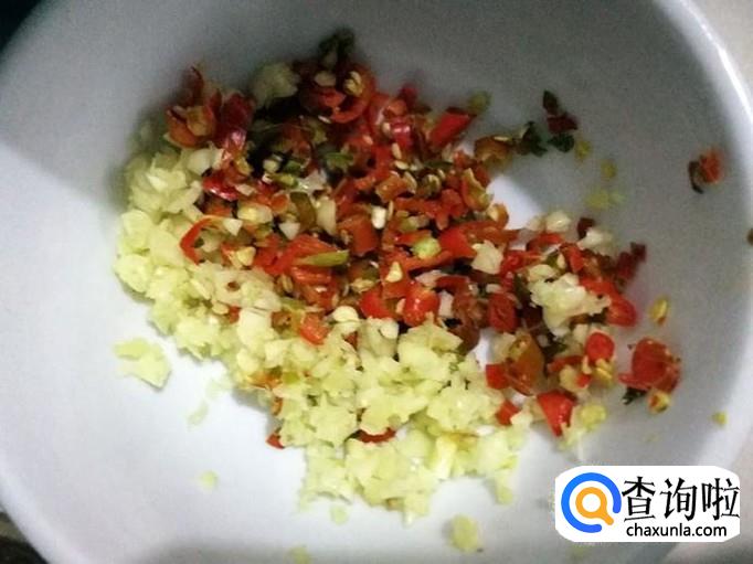 准备新鲜小米辣椒切碎、一部份蒜切碎,一部份大蒜去皮切片,老姜洗净切丝,泡辣椒剁碎、准备一勺豆瓣酱。