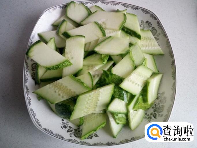 黄瓜用水清洗干净,控干水分,切成菱形片。