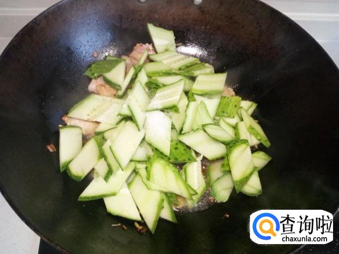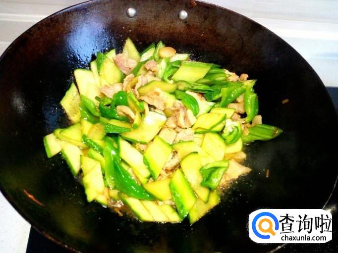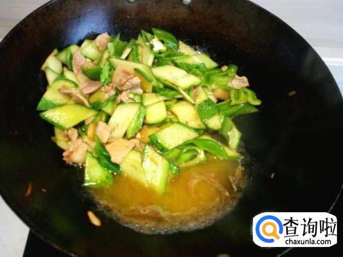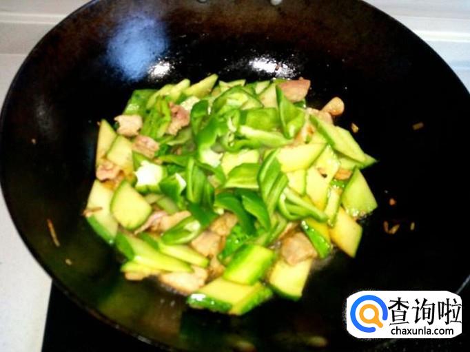 炒至肉片变软,颜色微白,放入黄瓜片大火爆炒,放入盐。