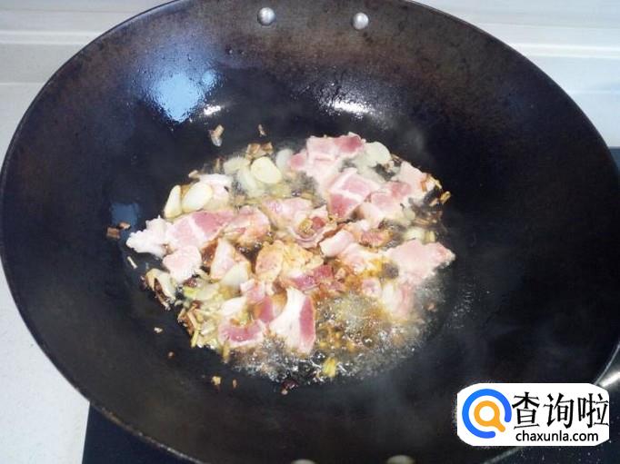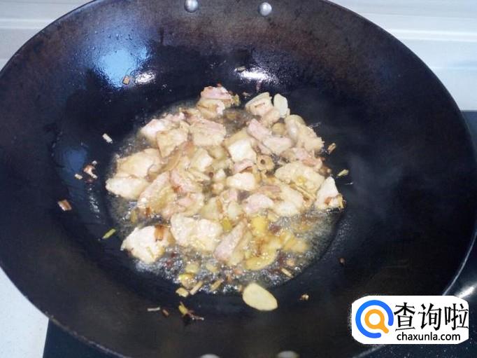 锅内放入油加热,油热后放入花椒,葱,姜,蒜,爆锅,放入肉翻炒,放入料酒,酱油。
