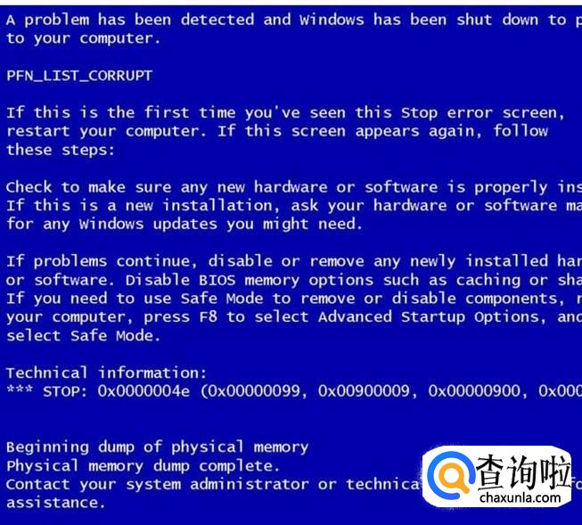 蓝屏的具体显示内容都差不多,具体原因也不好判断,但有一种情况例外,,就是如图所示,在下边有一行英文,有“plysical memory”字样,这基本可以断定是内存条的问题(当然没有这行字也不能排除内存)