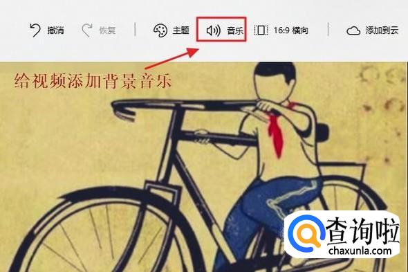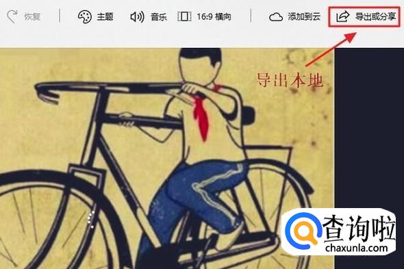 点击音乐以后,我们可以选择系统自带的音乐,也可以点击“你的音乐”,然后添加我们电脑本地的音乐,制作完成以后点击右上角的“导出或分享”,我们将其保存到自己需要的地方即可;