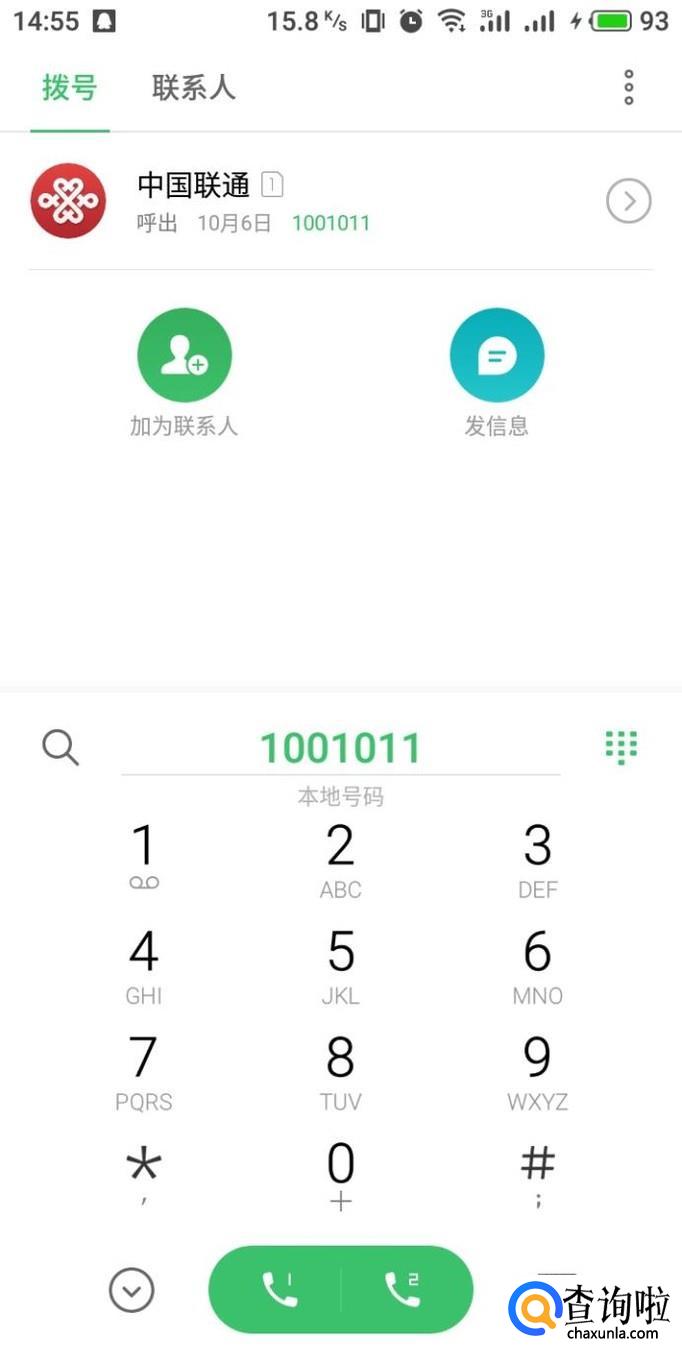 进入拨号界面之后,按键输入“1001011”拨号,然后选择相应的联通SIM卡进行拨打。