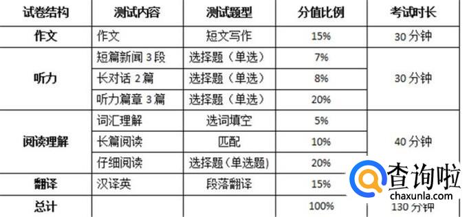四级分数分配:作文、听力、阅读理解,翻译四个部分。