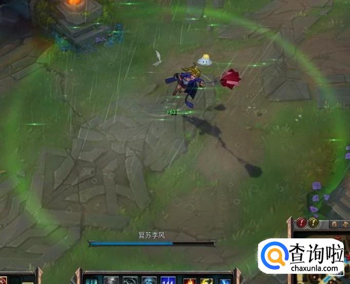 这款皮肤特效超足,QWER回城攻击等都有很多特效。R复苏季风还会下点雨出来,W攻击敌人的是一个云朵,Q风的颜色和地面差不多,不易躲避。