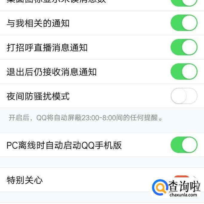 将“消息通知”中的选项翻到最下方,会出现“特别关心”的选项,点击进入,接着点击最下方的“添加特别关心好友”,选择要好友进行添加就OK了。