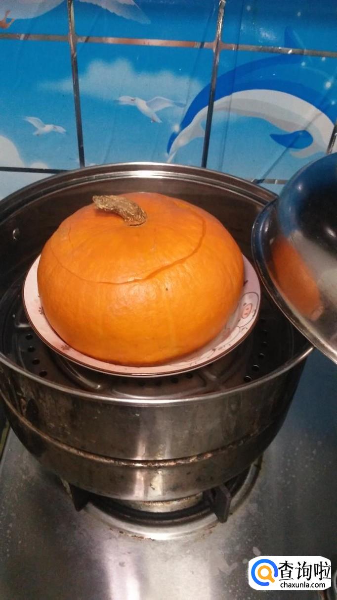 蒸锅中加入适量清水,然后将南瓜放上蒸锅,盖上锅盖,上面再加一个重物,这样蒸出来的效果更好。