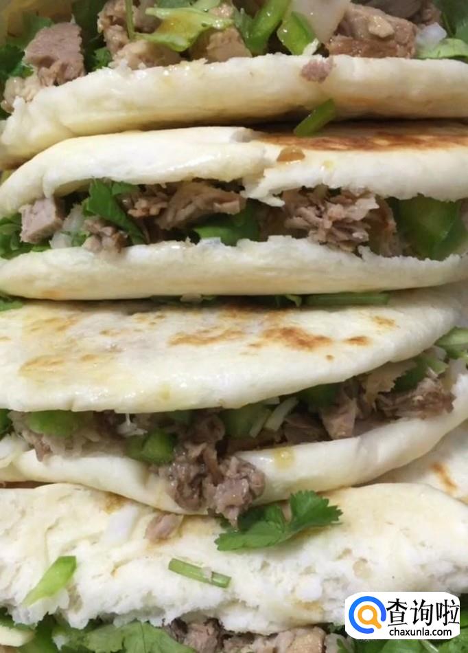 然后我们用刀从中间把饼片开,放上准备好的葱花,香菜,青椒,卤好的猪肉