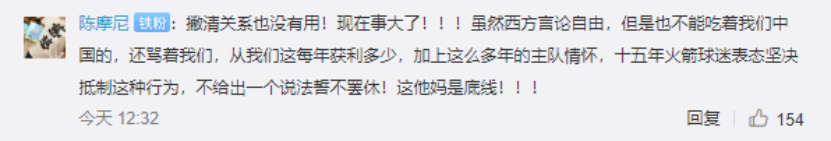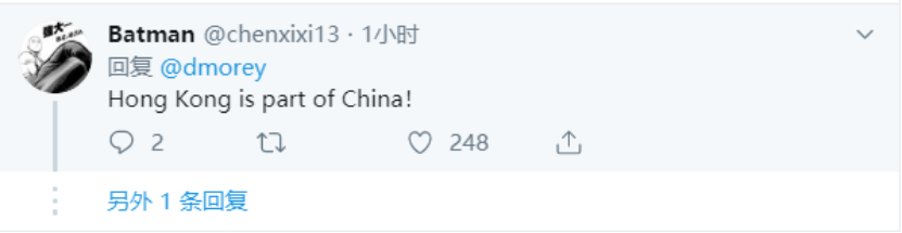 尽管如此,莫雷的言论已召来了中国球迷的不满与愤怒。 在莫雷发布的其他推文下,已有大量网友用英文表达自己的态度。