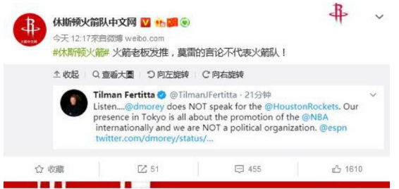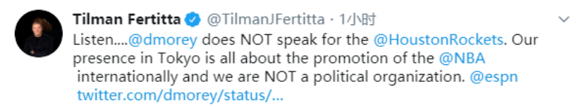 对于莫雷的言论,火箭队老板菲尔蒂塔5日也紧急发布推特澄清:莫雷不代表火箭队。“听着……莫雷不能代表休斯顿火箭队。我们来东京参加比赛是为了更好地推广NBA全球化,我们并不是政治组织。”↓