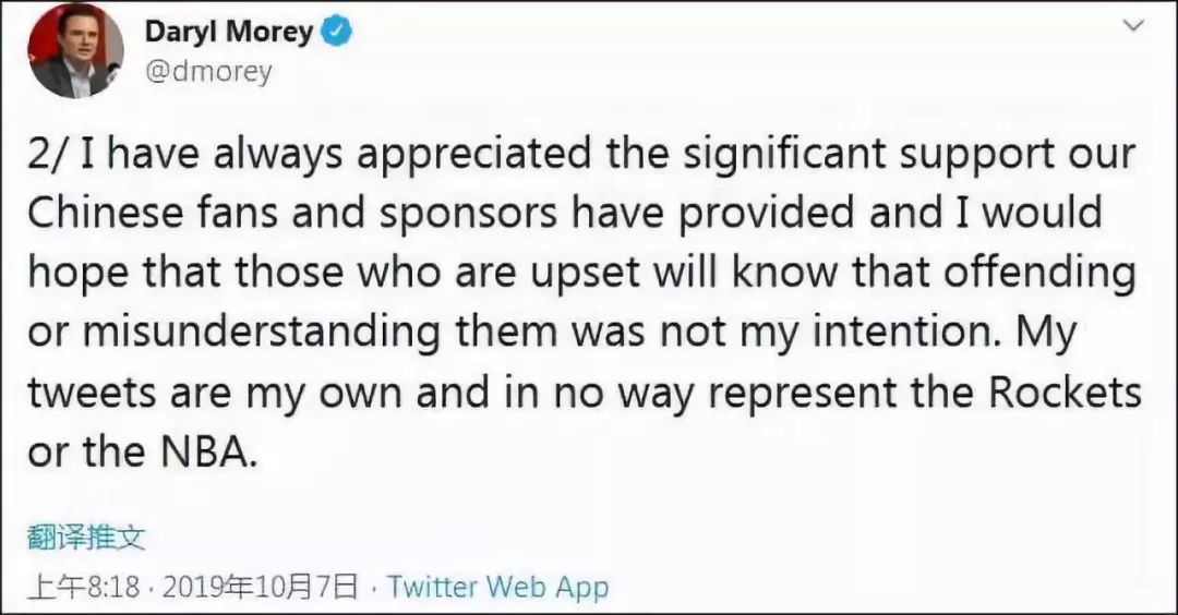 接着在第二条推特说:“我一直赞赏中国粉丝和赞助商的大力支持,我希望那些失望的人能明白,冒犯或者误解并非我的本意。我的推特只代表我本人,绝不代表火箭队或者NBA。”