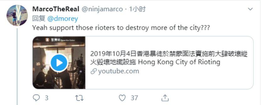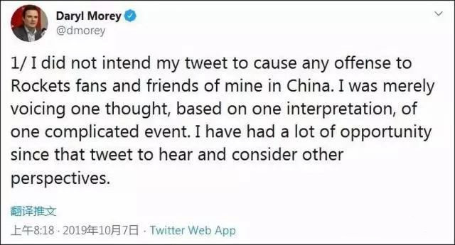 随后,莫雷在社交平台连发两篇推文作出回应,内容先是称:“我无意通过自己的推特冒犯火箭队粉丝和我在中国的朋友们。我只是基于某种阐释,对一个复杂事件表达某一种想法。自那条推特发出以后,我有机会倾听和思考其他(思考问题的)角度。”