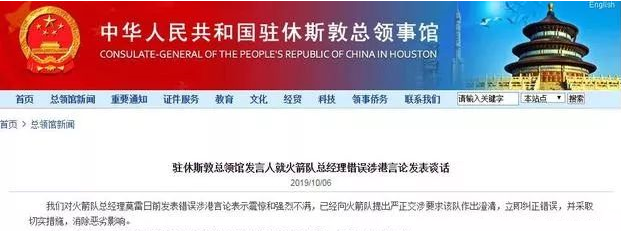 中国驻休斯敦总领馆发言人就莫雷涉港错误言论发表谈话,已经向火箭队提出严重交涉,要求该队立即纠正错误。