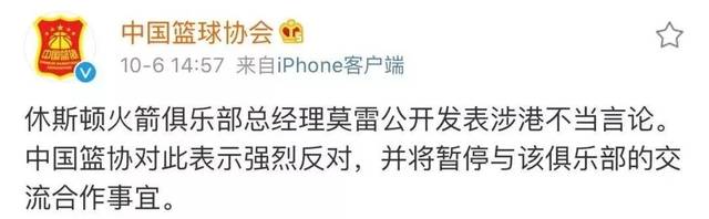 尽管莫雷事后迅速删除该消息,但他的言论造成的不良影响还在不断放大。10月6日14点59分,中国篮协通过官方微博发表声明,宣布“休斯顿火箭俱乐部总经理莫雷公开发表涉港不当言论。中国篮协对此表示强烈反对,并将暂停与该俱乐部的交流合作事宜。”