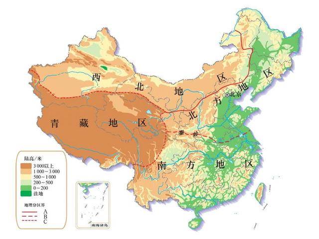 其中,秦岭、淮河一线是北方地区和南方地区的分界线。大兴安岭-阴山-贺兰山为北方地区和西北地区的分界线。我国青藏地区和西北地区,北方地区和南方地区的分界线,大致以第一级阶梯和第二级阶梯的分界线。