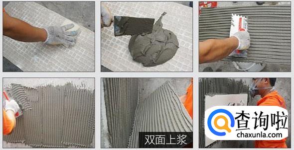 大面积施工时用刷子沾清水,刷一下瓷砖背面,然后用齿型刮板将瓷砖胶抹于瓷砖背面上,使之均匀分布,每次约抹1㎡左右,然后将瓷砖揉压上即可,同样的在工作墙面上均匀抹1㎡左右,两者齿纹呈十字交叉,压砖就可以了