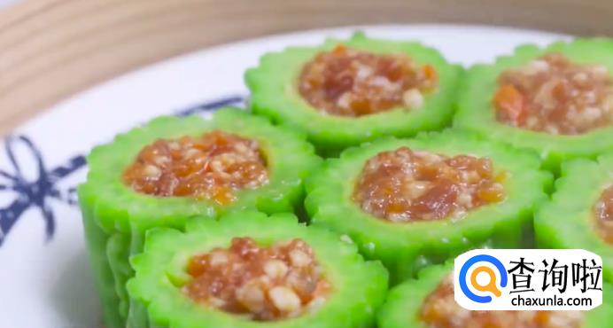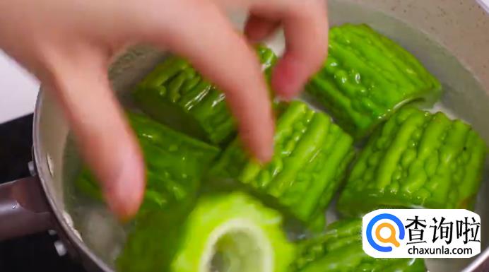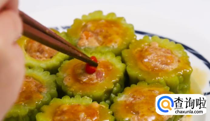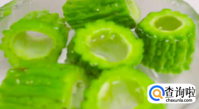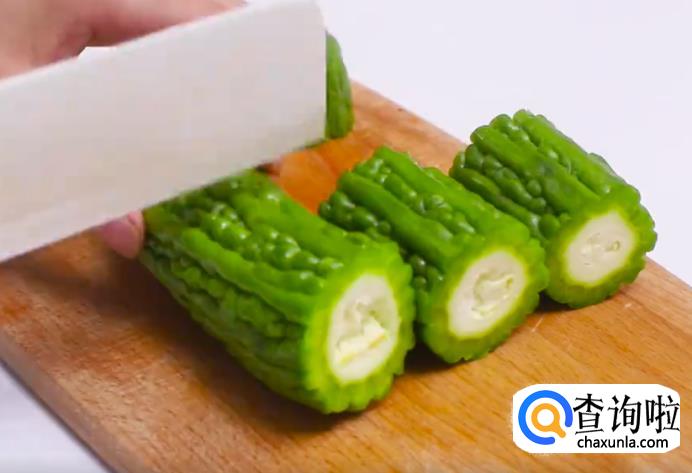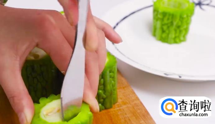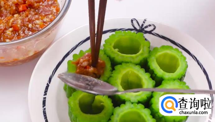之后将馅料塞到苦瓜的洞里,用筷子捣实。