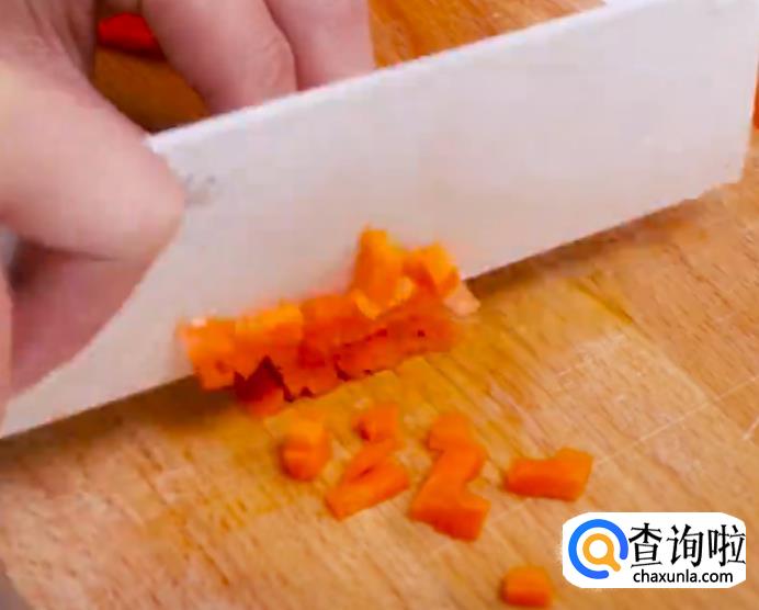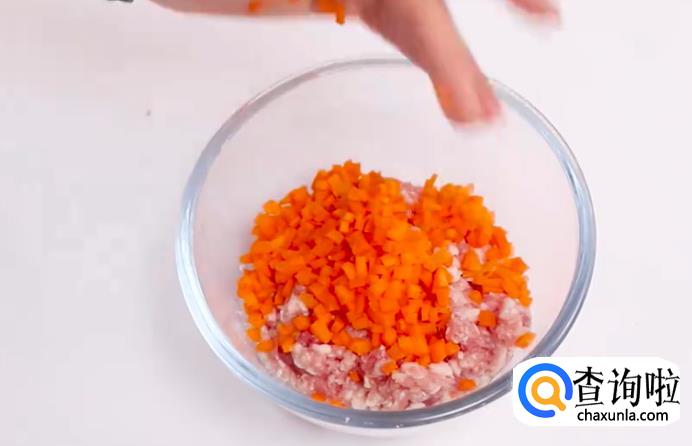 将五花肉剁成肉泥,加入胡萝卜丁。