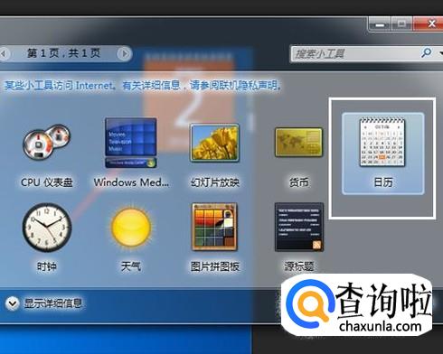 这时候我们可以看到桌面上一些小工具,选择日历,鼠标单击2次,就添加到桌面,如下图所示;