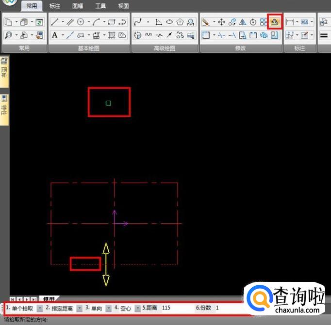 使用“等距线”,将矩形的底边向上偏置115,辅助线就绘制好了;