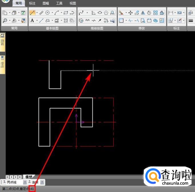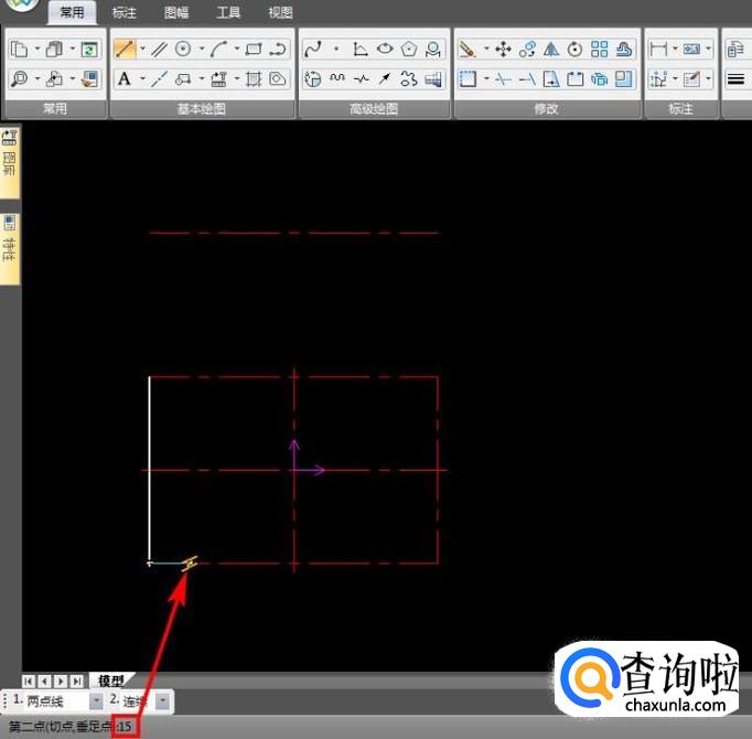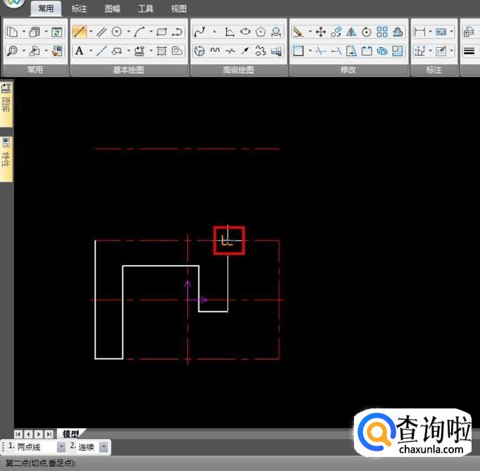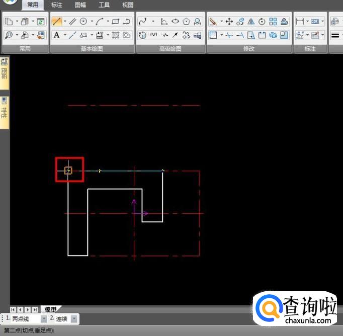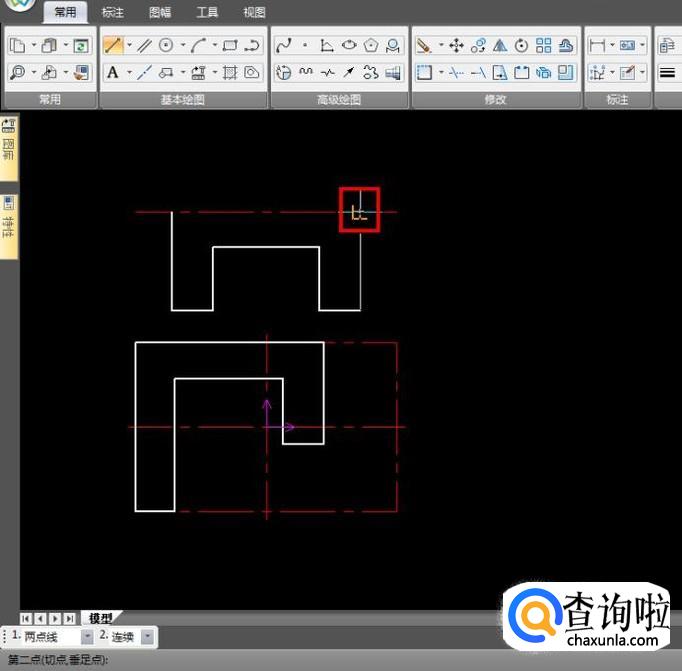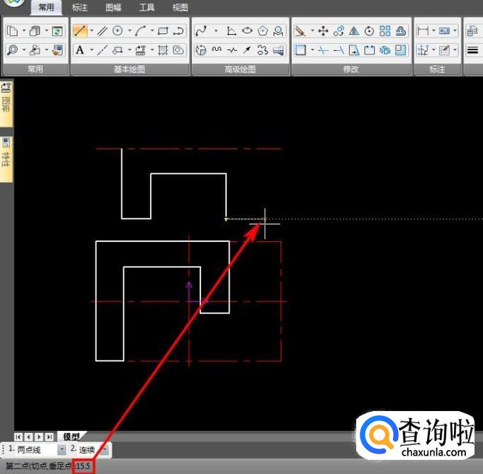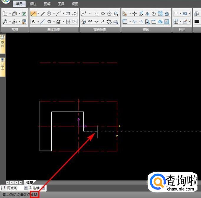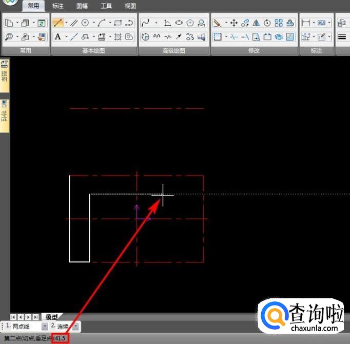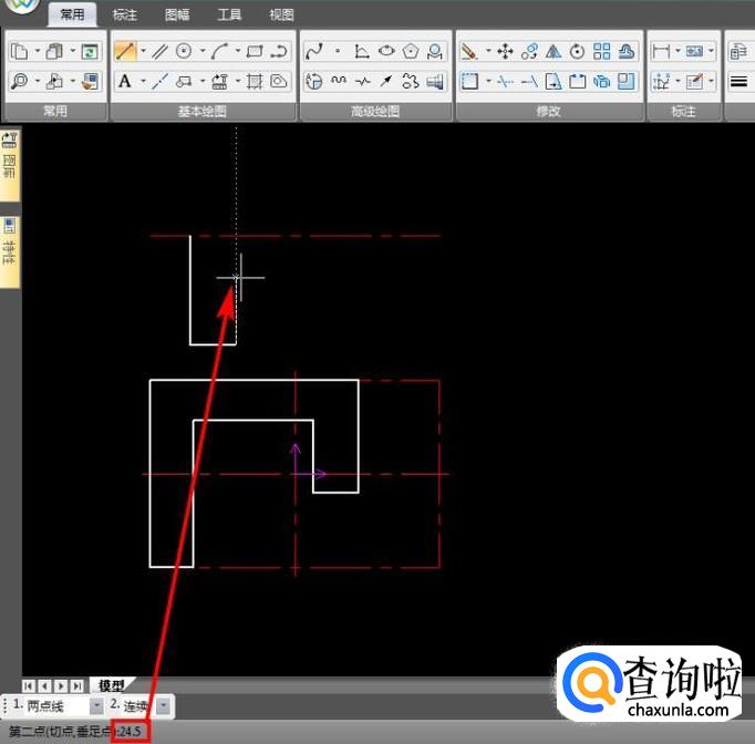 不取消直线命令,向下38,向右15.5,向上24.5,向右41,向下和左边的线段平齐,向右15.5,向上和点划线相交,向左到起点,封闭线框;