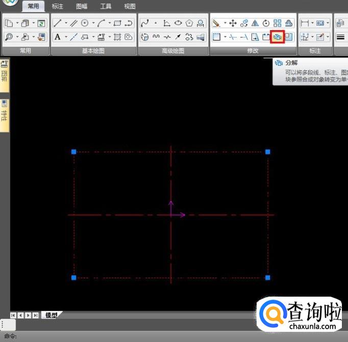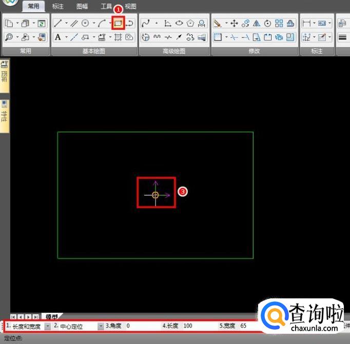 打开caxa,新建空白图纸,先切换图层到中心线层,使用矩形命令,以坐标原点为中心绘制长100宽65带中心线的矩形;