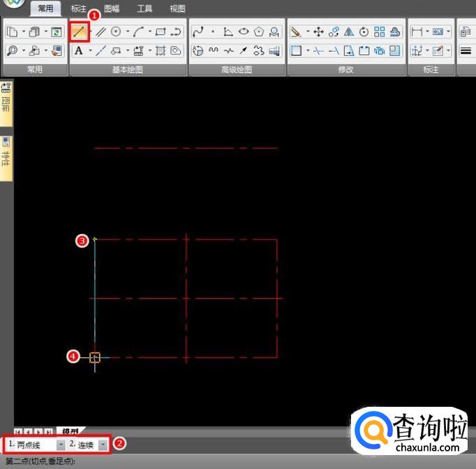 切换图层到粗实线层,使用直线命令开始绘制连续线段,以矩形左上角为起点,向下到矩形左下角,绘制出第一条线段;