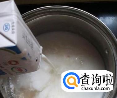 等燕麦煮到胀大时,就可以倒入牛奶,用勺搅拌均匀。