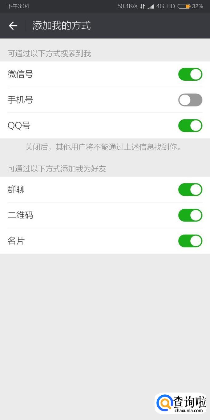 最后关闭不想让别人搜索到我们微信账号的添加方式即可。